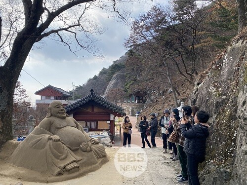 해수욕장 백사장에서만 보던 모래조각이 산속 사찰에 조성돼 눈길을 끌고 있습니다.