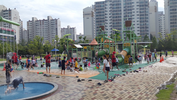 6월 30일 개장한 명촌근린공원과 신천어린이공원 물놀이장은 조합놀이대와 감성놀이벽 놀이대, 나뭇잎샤워, 주사위놀이대 등을 갖추고, 안전요원 4명이 배치됐다.